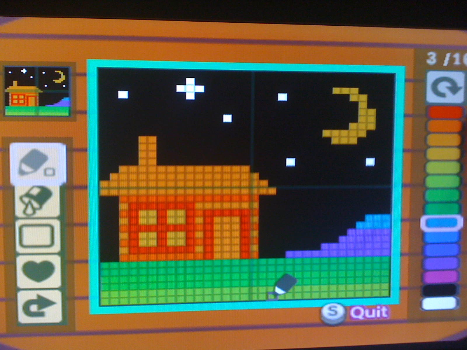 Inside were a lot of fabrics and a couple of hard-working hedgehogs – or needlemice, perhaps, it’s hard to tell. Having been told that I could fashion my own, er, fashion, I ended up staring at a pixel grid that made me all awash with nostalgia for Mario Paint on the SNES. In fact, I was feeling so retro that I decided to make a design loosely based on one of the borders from the Super Game Boy, thusly: